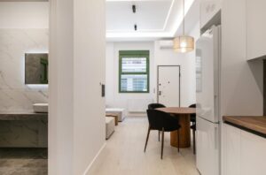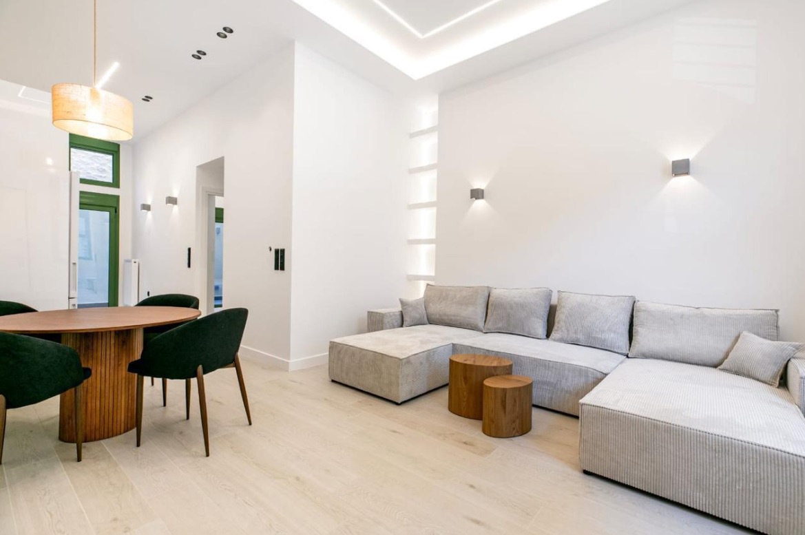 Luxurious ground floor apartment, measuring 64 sq m., in Piraeus. It consists of a living room with open